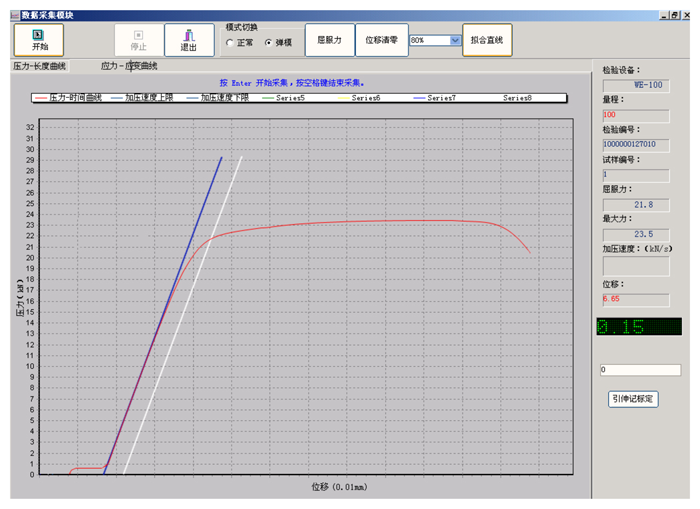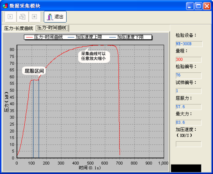 ★ 材料試驗機上加裝壓力、位移等傳感器,計算機自動從檢測儀器設備上動態(tài)采集檢測數(shù)據(jù);